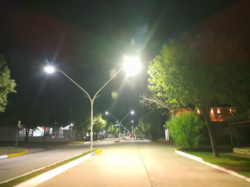 La avenida de ingreso a la localidad luce totalmente iluminada.